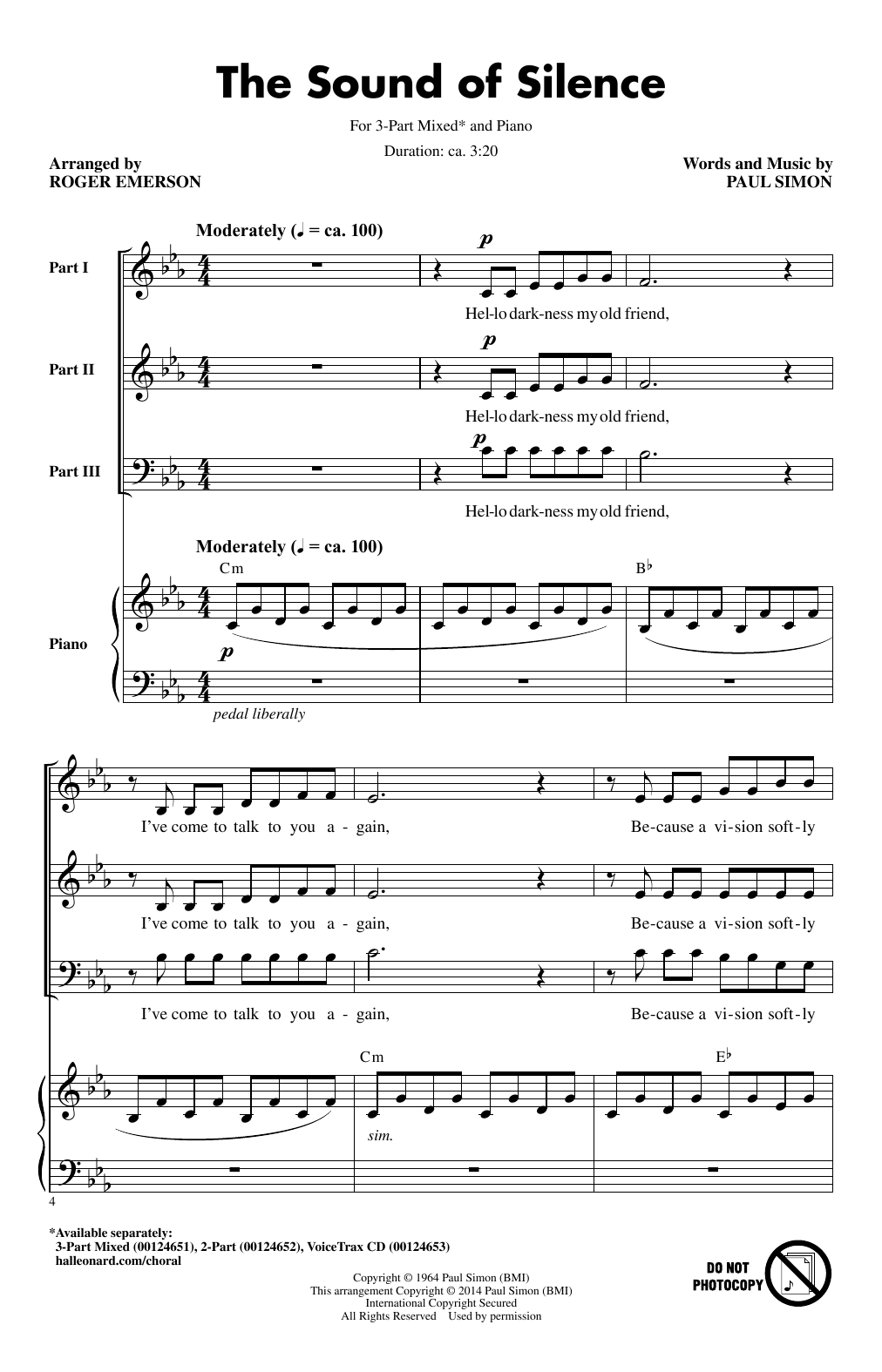 Download or print Simon & Garfunkel The Sound Of Silence (arr. Roger Emerson) sheet music, chords and digital score arranged for 3-Part Mixed Choir. This Folk score includes 13 page(s).