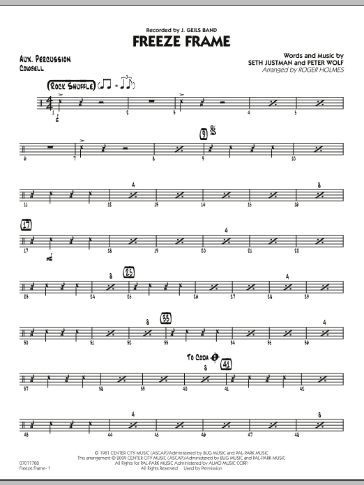 Download or print Roger Holmes Freeze Frame - Aux Percussion sheet music, chords and digital score arranged for Jazz Ensemble. This Pop score includes 2 page(s).