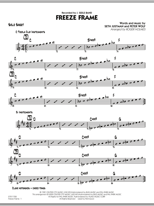 Download or print Roger Holmes Freeze Frame - Solo Sheet sheet music, chords and digital score arranged for Jazz Ensemble. This Pop score includes 2 page(s).