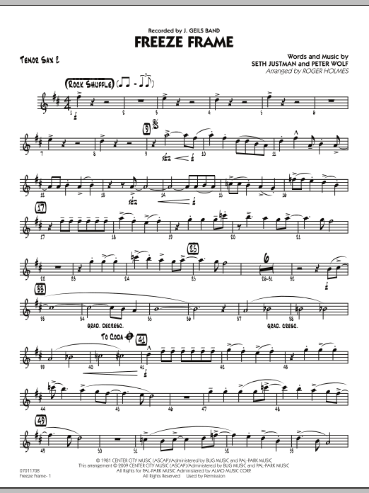 Download or print Roger Holmes Freeze Frame - Tenor Sax 2 sheet music, chords and digital score arranged for Jazz Ensemble. This Pop score includes 2 page(s).