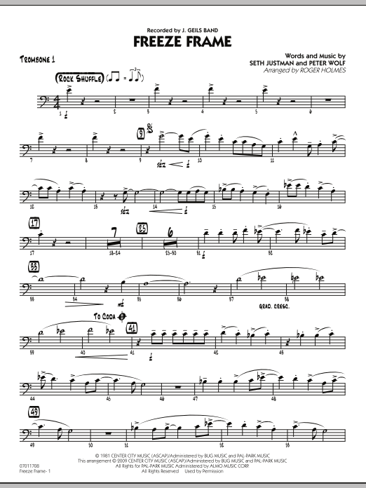 Download or print Roger Holmes Freeze Frame - Trombone 1 sheet music, chords and digital score arranged for Jazz Ensemble. This Pop score includes 2 page(s).