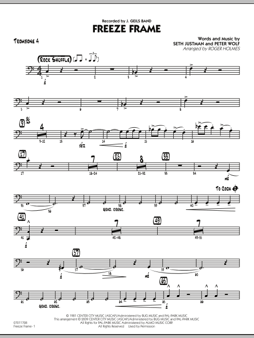 Download or print Roger Holmes Freeze Frame - Trombone 4 sheet music, chords and digital score arranged for Jazz Ensemble. This Pop score includes 2 page(s).