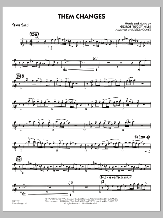 Download or print Roger Holmes Them Changes - Tenor Sax 1 sheet music, chords and digital score arranged for Jazz Ensemble. This Jazz score includes 2 page(s).