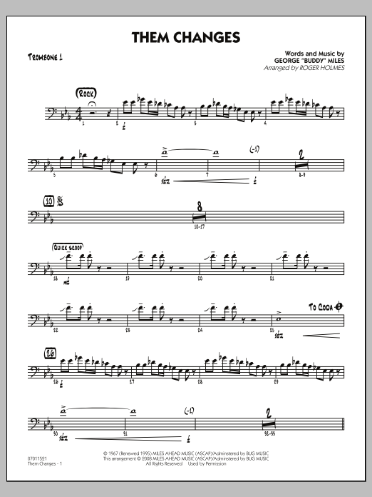 Download or print Roger Holmes Them Changes - Trombone 1 sheet music, chords and digital score arranged for Jazz Ensemble. This Jazz score includes 2 page(s).