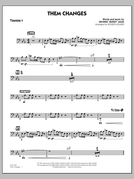 Download or print Roger Holmes Them Changes - Trombone 4 sheet music, chords and digital score arranged for Jazz Ensemble. This Jazz score includes 2 page(s).