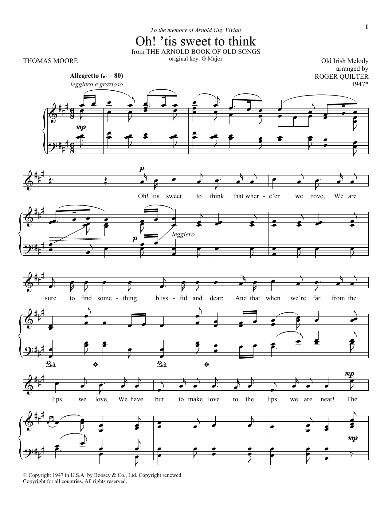 Download or print Roger Quilter Oh! 'Tis Sweet To Think sheet music, chords and digital score arranged for Piano & Vocal. This Classical score includes 5 page(s).