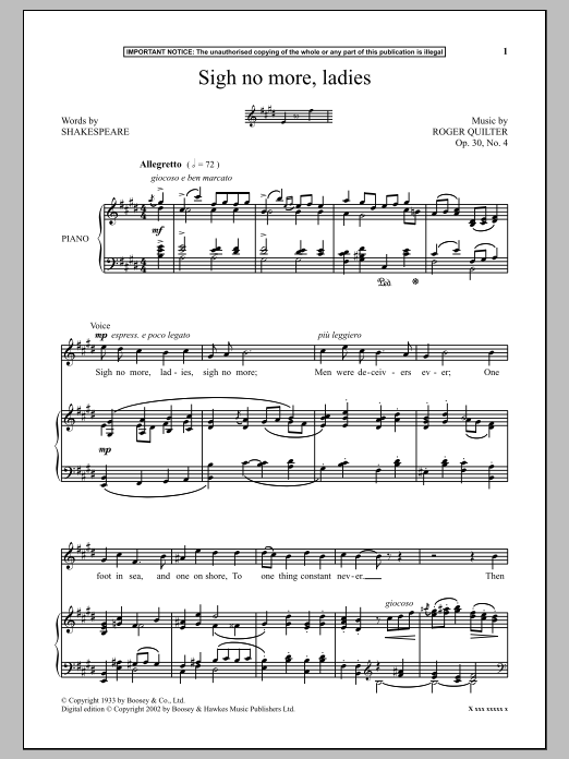 Download or print Roger Quilter Sigh No More, Ladies sheet music, chords and digital score arranged for Piano & Vocal. This Musical/Show score includes 4 page(s).