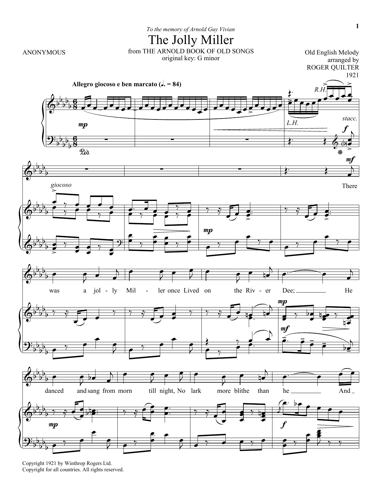 Download or print Roger Quilter The Jolly Miller sheet music, chords and digital score arranged for Piano & Vocal. This Classical score includes 5 page(s).
