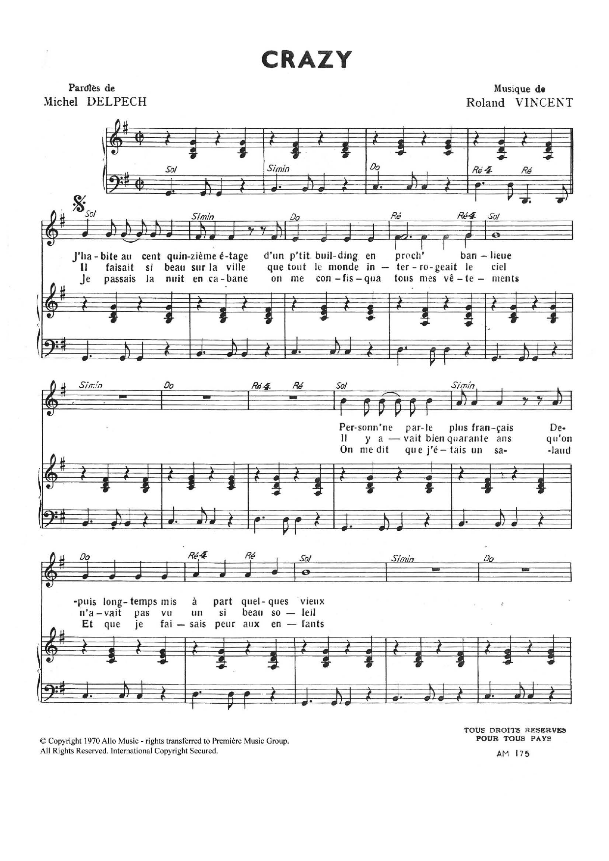 Download or print Roland Vincent Crazy sheet music, chords and digital score arranged for Piano & Vocal. This Pop score includes 3 page(s).
