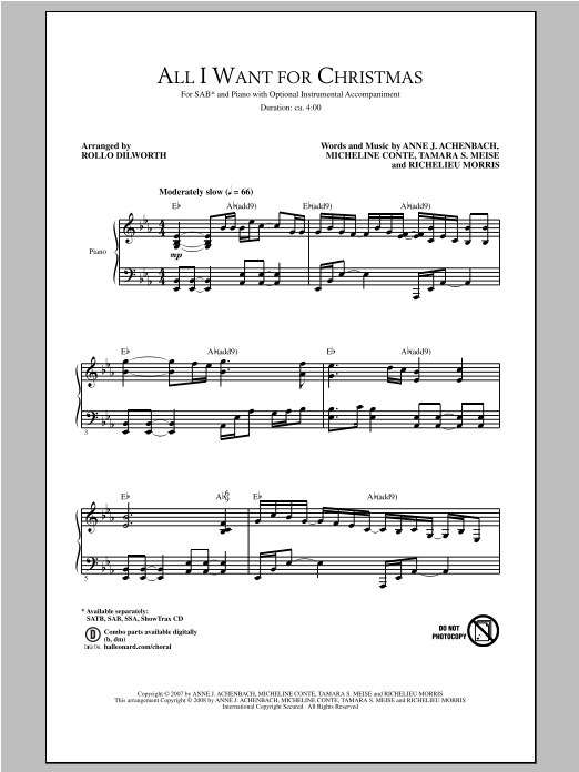 Download or print Rollo Dilworth All I Want For Christmas sheet music, chords and digital score arranged for SAB Choir. This Christmas score includes 10 page(s).