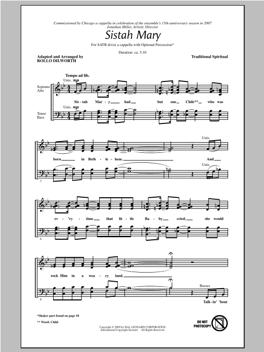 Download or print Rollo Dilworth Sistah Mary sheet music, chords and digital score arranged for SATB Choir. This Christian score includes 10 page(s).