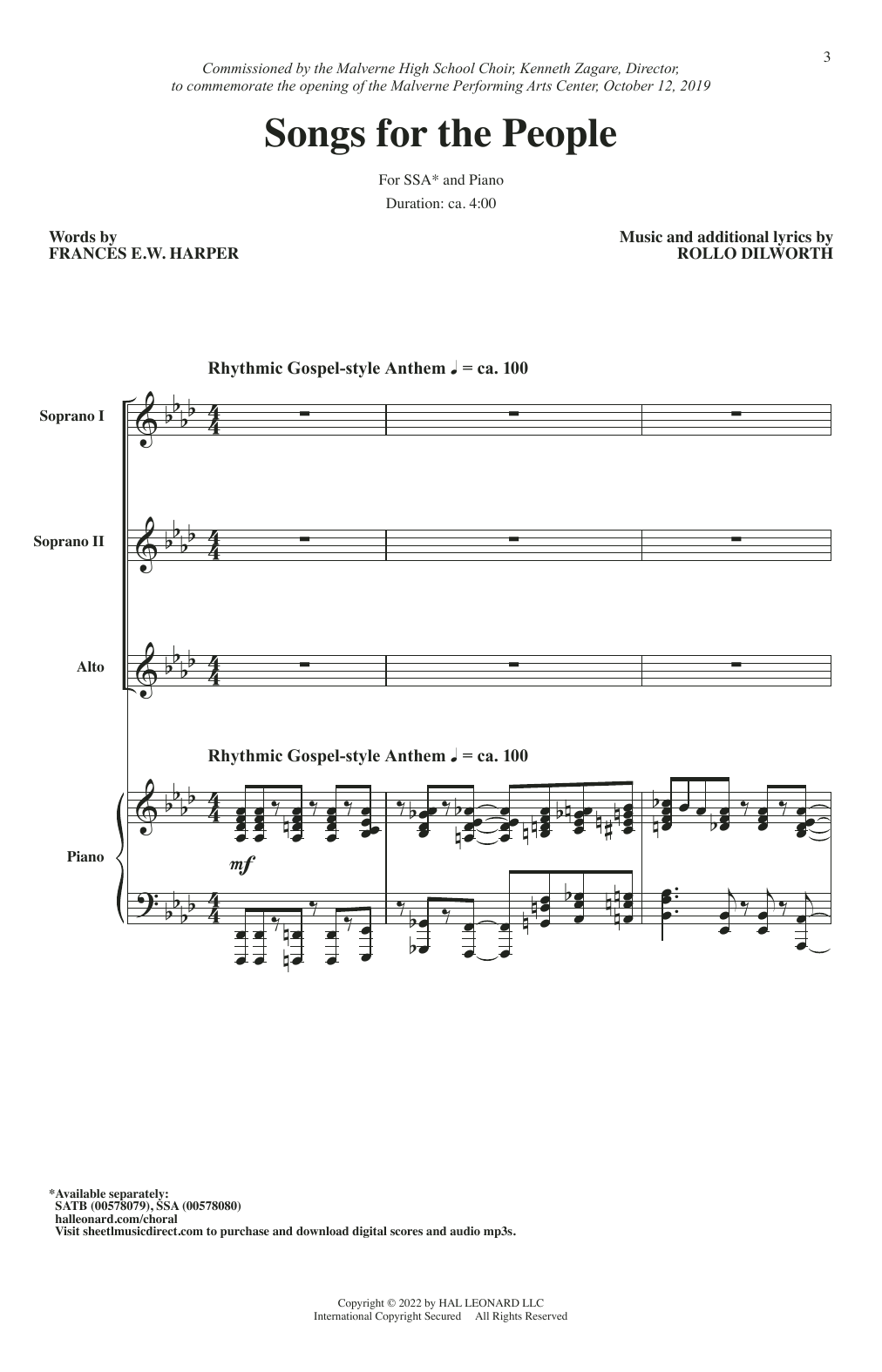 Download or print Rollo Dilworth Songs For The People sheet music, chords and digital score arranged for SSA Choir. This Concert score includes 18 page(s).