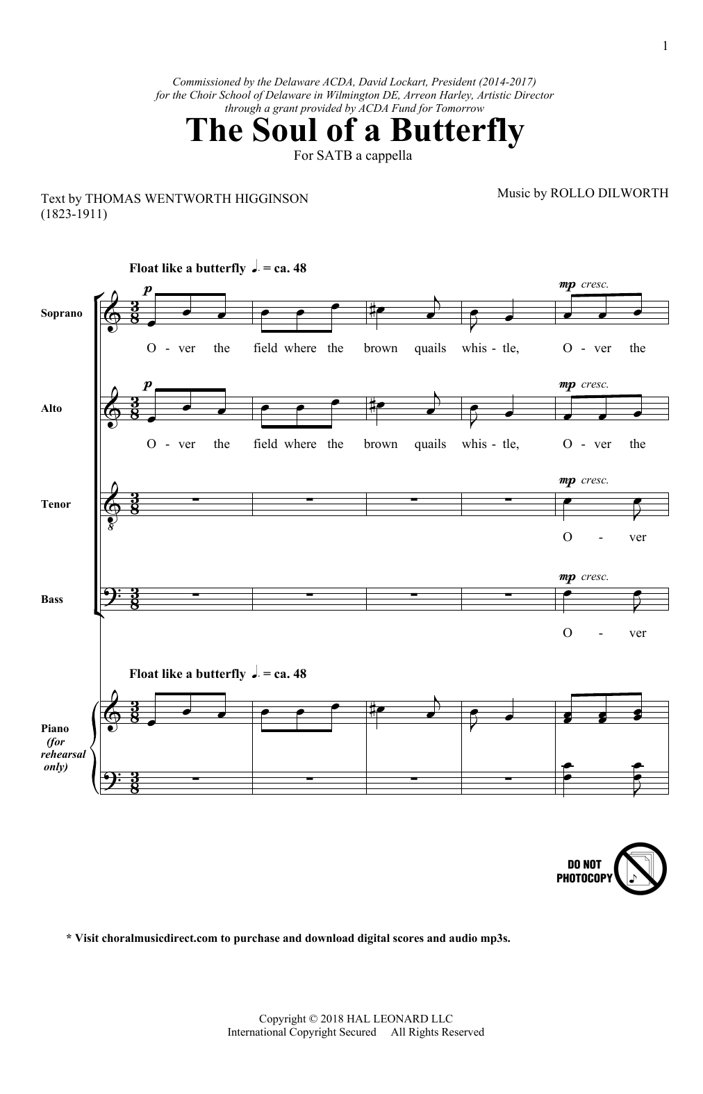 Download or print Rollo Dilworth The Soul Of A Butterfly sheet music, chords and digital score arranged for SATB Choir. This Concert score includes 6 page(s).