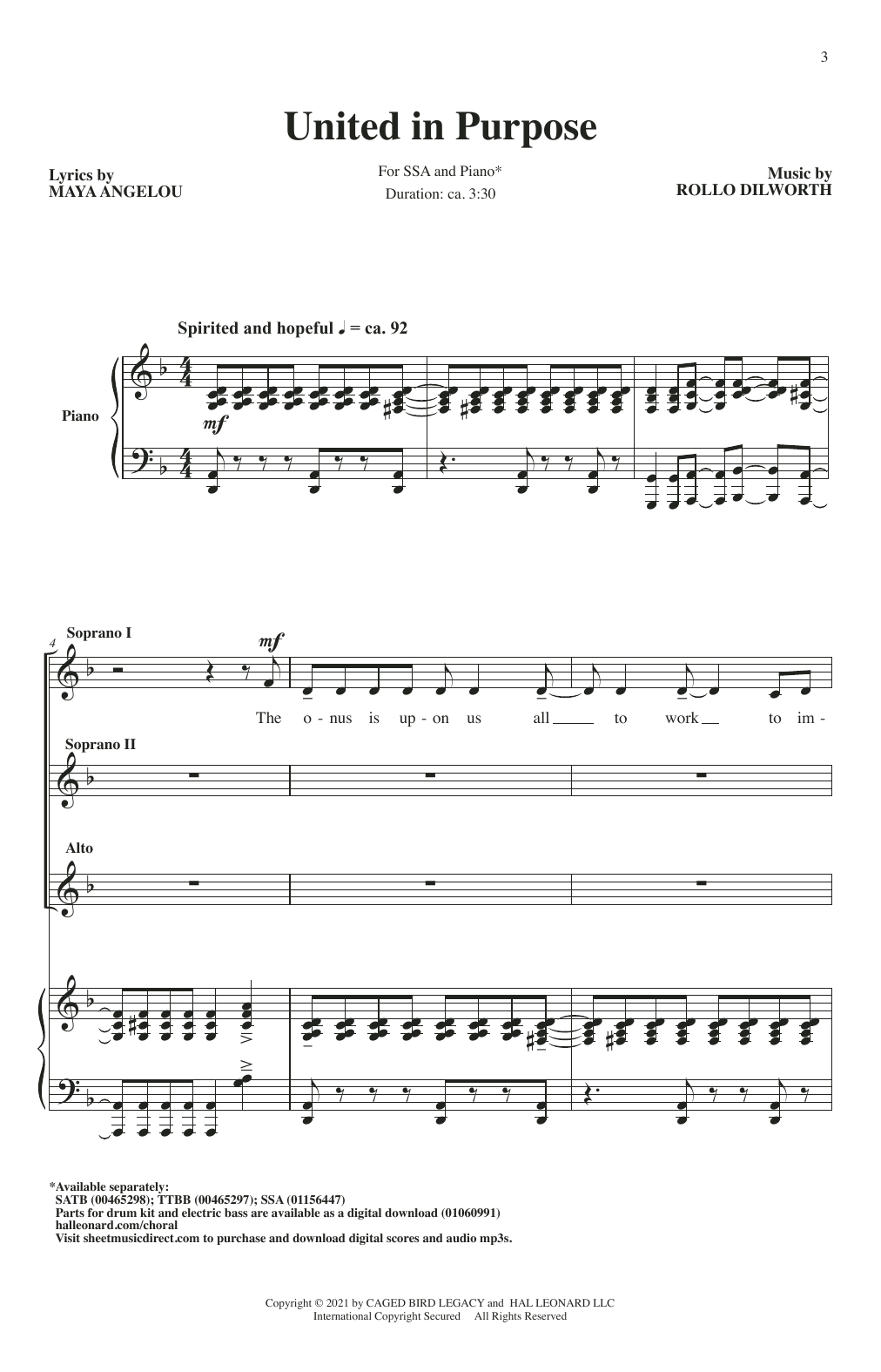 Download or print Rollo Dilworth United In Purpose sheet music, chords and digital score arranged for SSA Choir. This Inspirational score includes 15 page(s).