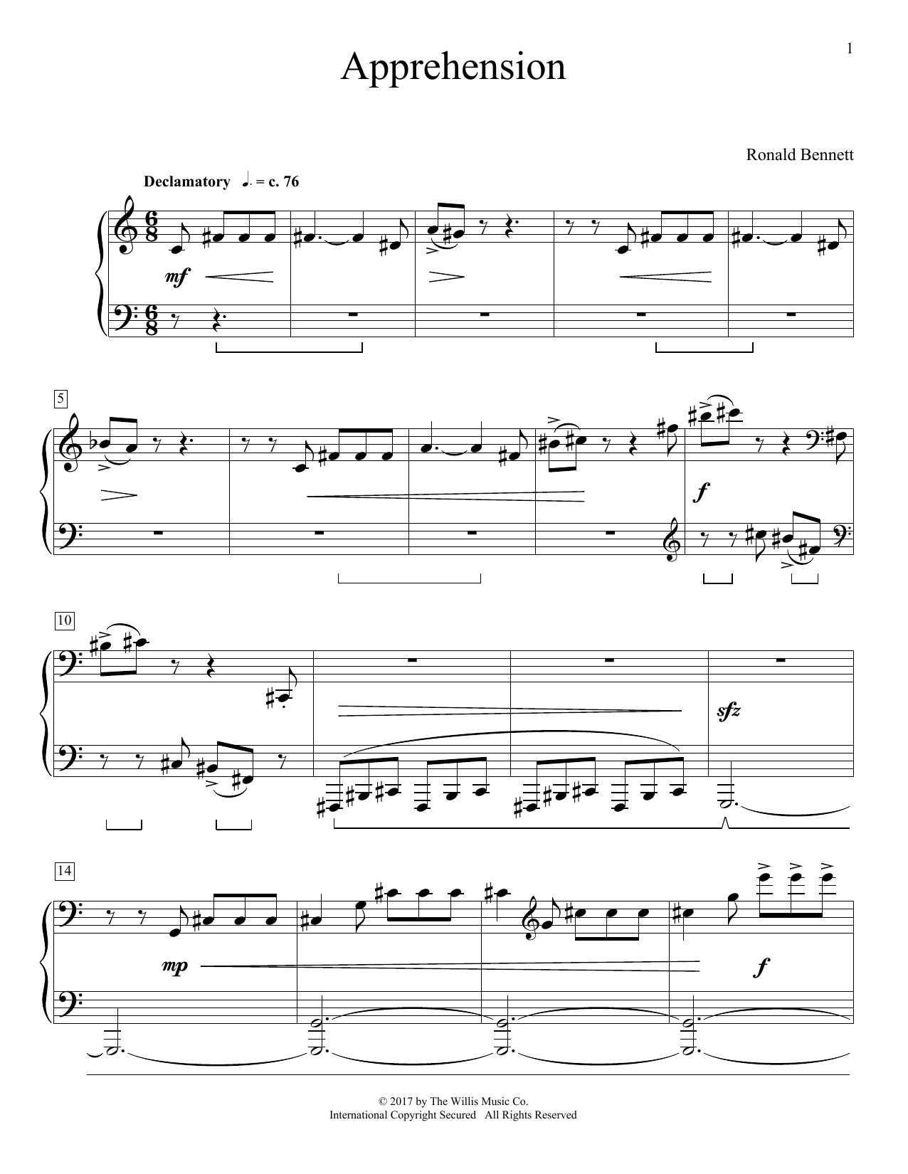 Download or print Ronald Bennett Apprehension sheet music, chords and digital score arranged for Educational Piano. This Instructional score includes 2 page(s).