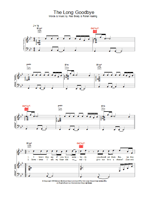 Download or print Ronan Keating The Long Goodbye sheet music, chords and digital score arranged for Piano, Vocal & Guitar Chords. This Pop score includes 6 page(s).