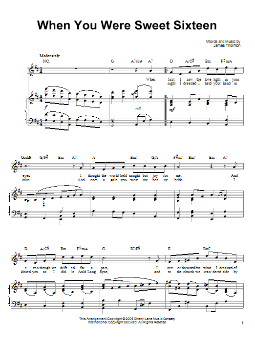 Download or print Ronan Tynan When You Were Sweet Sixteen sheet music, chords and digital score arranged for Piano, Vocal & Guitar Chords (Right-Hand Melody). This Classical score includes 2 page(s).