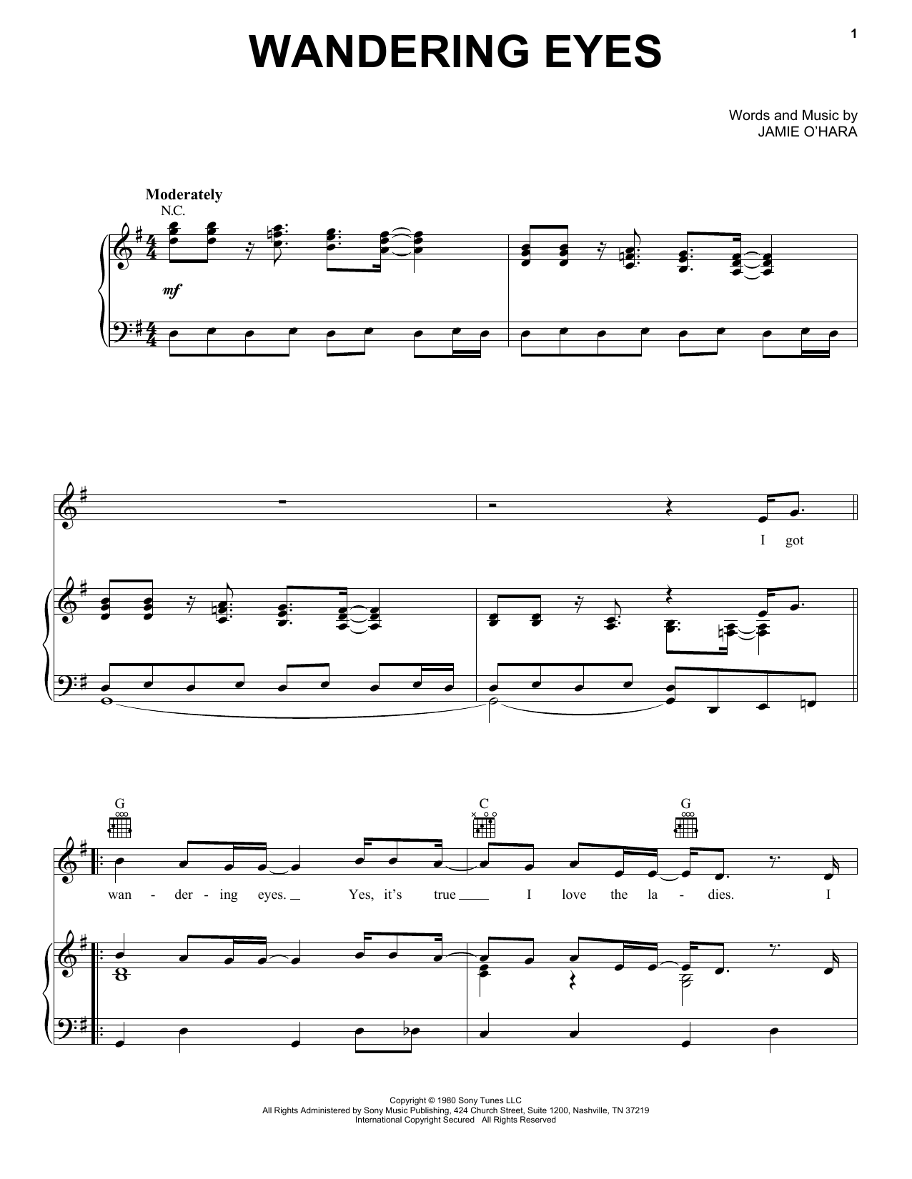 Download or print Ronnie McDowell Wandering Eyes sheet music, chords and digital score arranged for Piano, Vocal & Guitar Chords (Right-Hand Melody). This Country score includes 6 page(s).