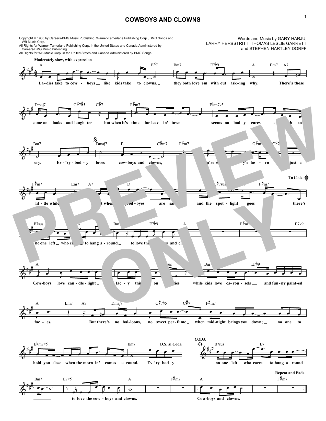 Download or print Ronnie Milsap Cowboys And Clowns sheet music, chords and digital score arranged for Lead Sheet / Fake Book. This Country score includes 1 page(s).