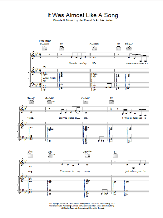 Download or print Ronnie Milsap It Was Almost Like A Song sheet music, chords and digital score arranged for Piano, Vocal & Guitar Chords (Right-Hand Melody). This Country score includes 3 page(s).