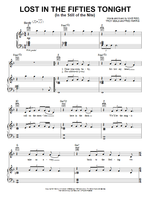 Download or print Ronnie Milsap Lost In The Fifties Tonight (In The Still Of The Nite) sheet music, chords and digital score arranged for Easy Piano. This Country score includes 3 page(s).