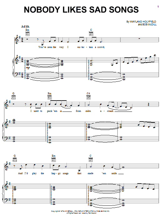 Download or print Ronnie Milsap Nobody Likes Sad Songs sheet music, chords and digital score arranged for Piano, Vocal & Guitar Chords (Right-Hand Melody). This Country score includes 4 page(s).