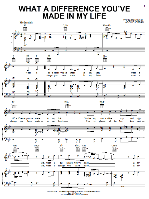 Download or print Ronnie Milsap What A Difference You've Made In My Life sheet music, chords and digital score arranged for Piano, Vocal & Guitar Chords (Right-Hand Melody). This Country score includes 4 page(s).