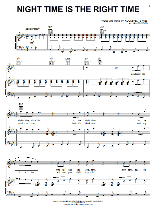 Download or print Roosevelt Sykes Night Time Is The Right Time sheet music, chords and digital score arranged for Piano, Vocal & Guitar Chords (Right-Hand Melody). This Blues score includes 3 page(s).