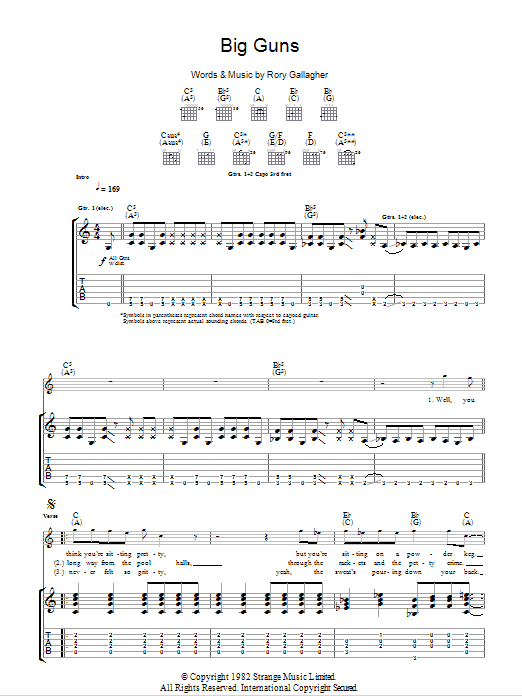 Download or print Rory Gallagher Big Guns sheet music, chords and digital score arranged for Guitar Tab. This Rock score includes 8 page(s).