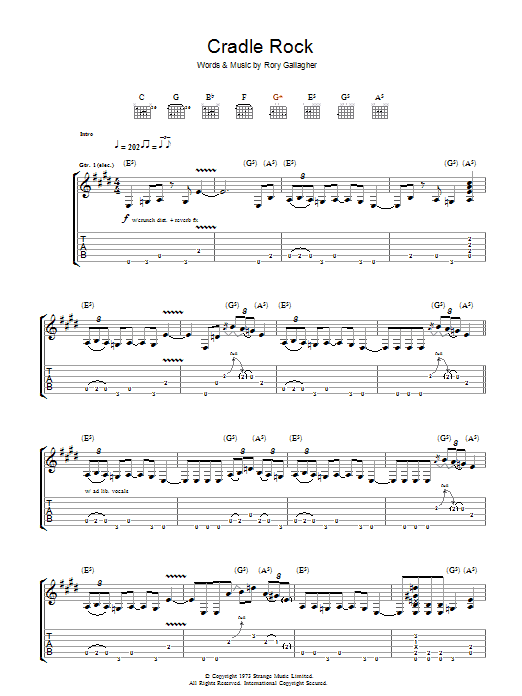 Download or print Rory Gallagher Cradle Rock sheet music, chords and digital score arranged for Guitar Tab. This Blues score includes 10 page(s).