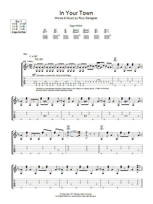 Download or print Rory Gallagher In Your Town sheet music, chords and digital score arranged for Guitar Tab. This Rock score includes 15 page(s).