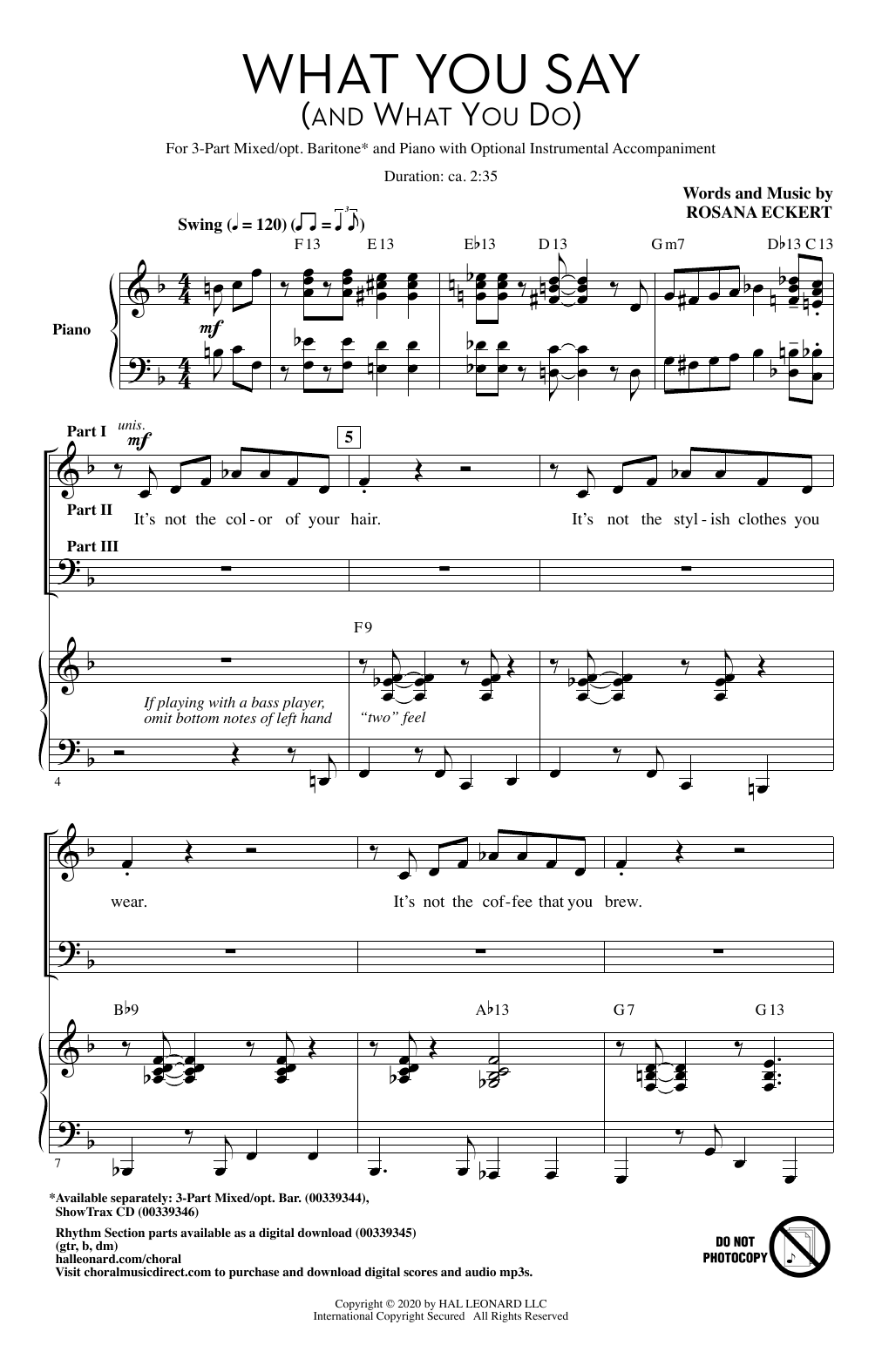 Download or print Rosana Eckert What You Say (And What You Do) sheet music, chords and digital score arranged for 3-Part Mixed Choir. This Jazz score includes 9 page(s).