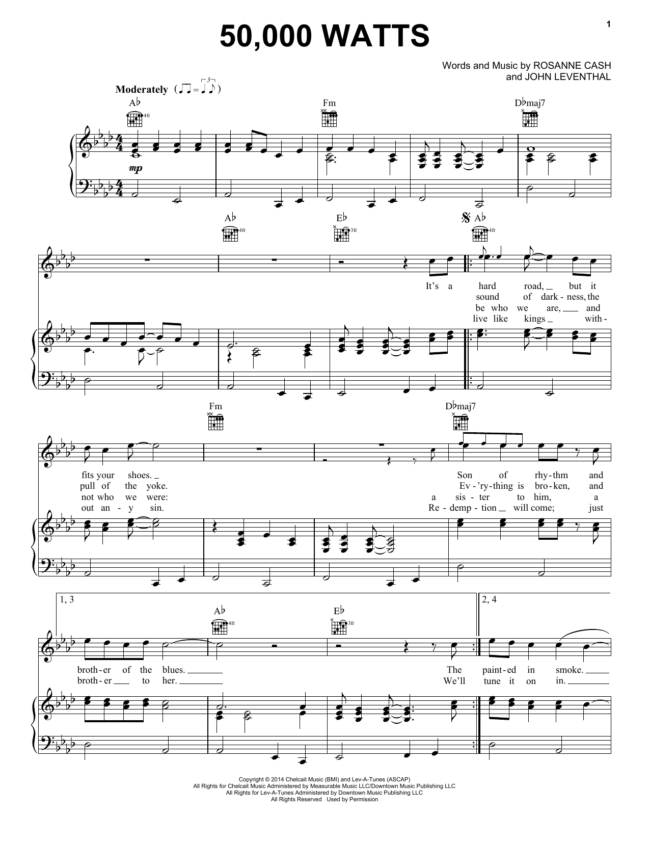 Download or print Rosanne Cash 50,000 Watts sheet music, chords and digital score arranged for Piano, Vocal & Guitar Chords (Right-Hand Melody). This Country score includes 3 page(s).