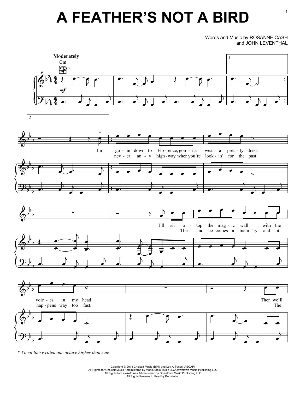 Download or print Rosanne Cash A Feather's Not A Bird sheet music, chords and digital score arranged for Piano, Vocal & Guitar Chords (Right-Hand Melody). This Pop score includes 5 page(s).