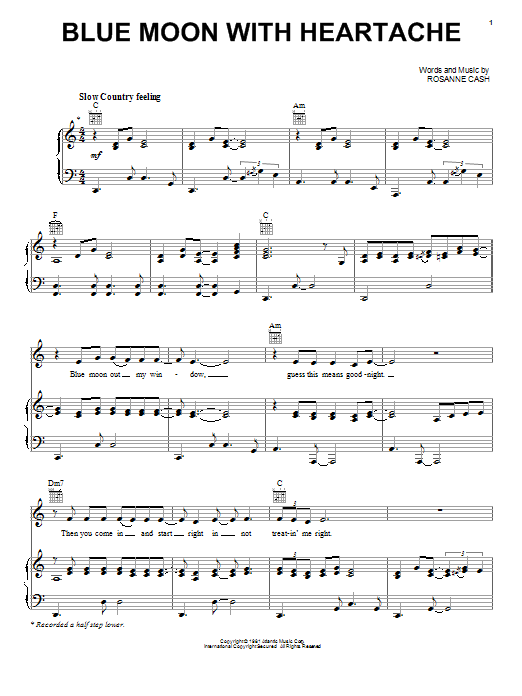 Download or print Rosanne Cash Blue Moon With Heartache sheet music, chords and digital score arranged for Piano, Vocal & Guitar Chords (Right-Hand Melody). This Pop score includes 6 page(s).