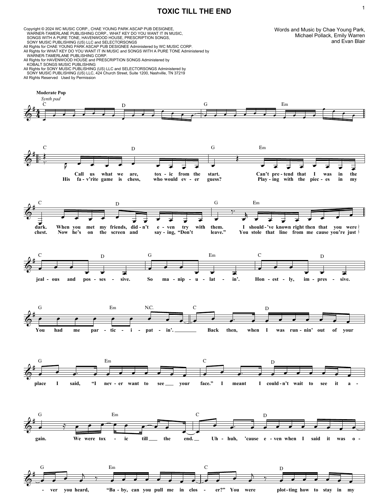Download or print Rosé toxic till the end sheet music, chords and digital score arranged for Lead Sheet / Fake Book. This Pop score includes 2 page(s).