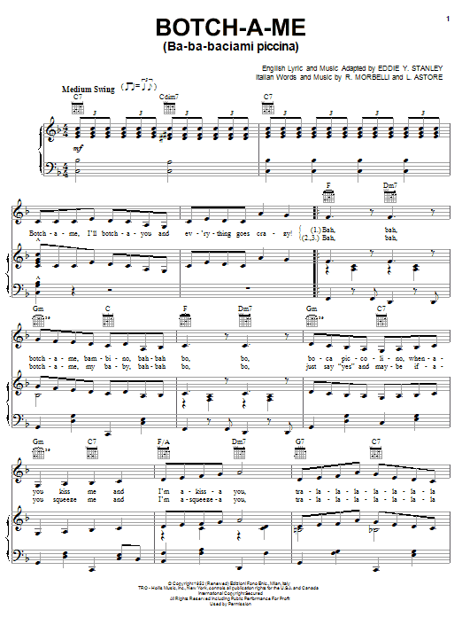 Download or print Rosemary Clooney Botch-A-Me (Ba-Ba-Baciami Piccina) sheet music, chords and digital score arranged for Piano, Vocal & Guitar Chords (Right-Hand Melody). This Jazz score includes 3 page(s).