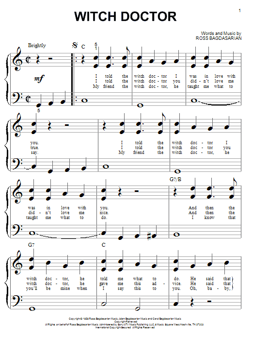 Download or print Ross Bagdasarian Witch Doctor sheet music, chords and digital score arranged for Big Note Piano. This Children score includes 4 page(s).
