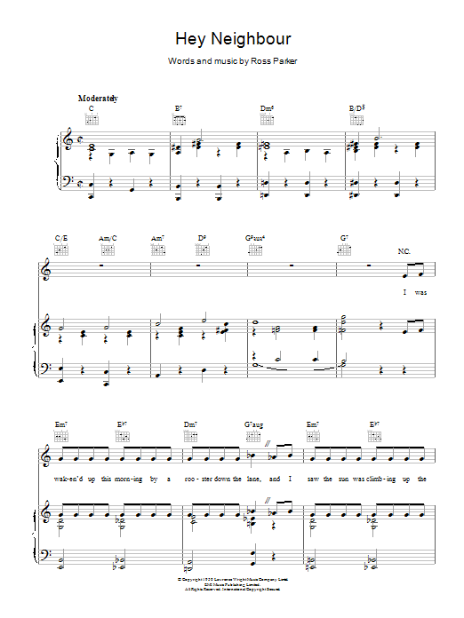 Download or print Ross Parker Hey Neighbour sheet music, chords and digital score arranged for Piano, Vocal & Guitar Chords. This Pop score includes 6 page(s).