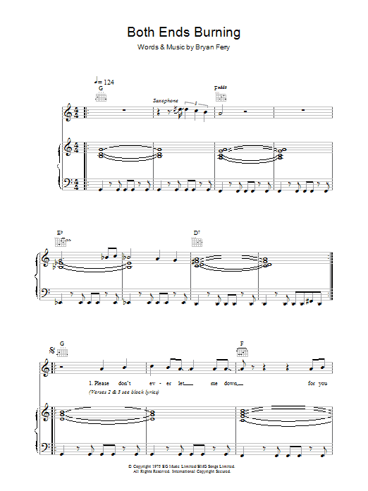 Download or print Roxy Music Both Ends Burning sheet music, chords and digital score arranged for Piano, Vocal & Guitar Chords. This Pop score includes 6 page(s).