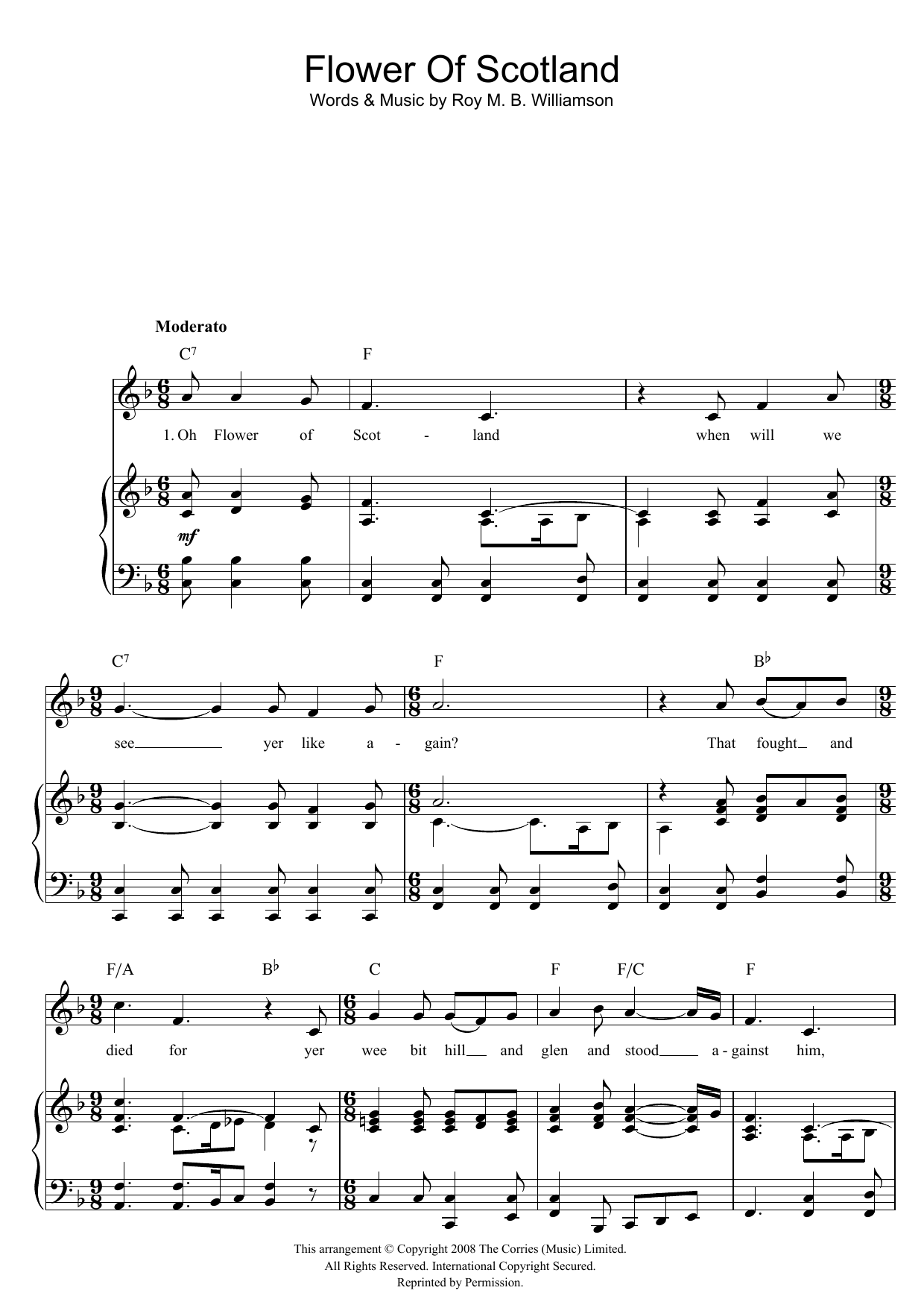 Download or print Roy M. B. Williamson Flower Of Scotland (Unofficial Scottish National Anthem) sheet music, chords and digital score arranged for Piano, Vocal & Guitar Chords. This Inspirational score includes 2 page(s).