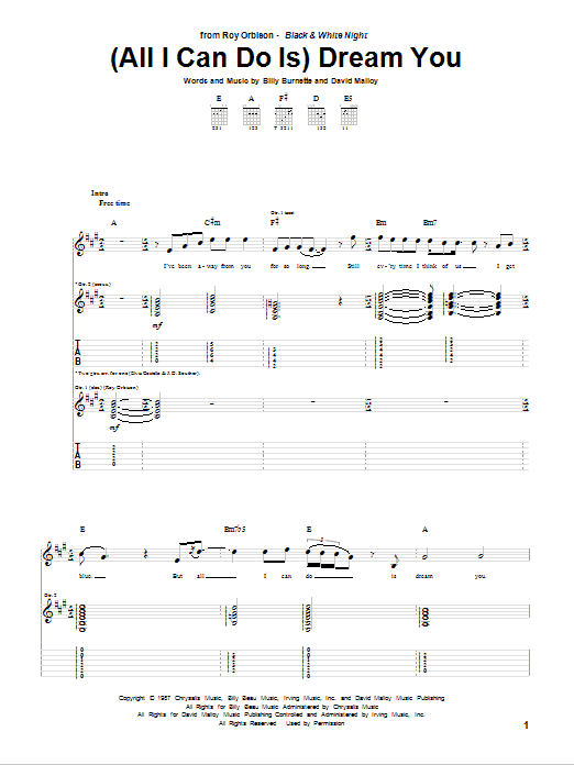 Download or print Roy Orbison (All I Can Do Is) Dream You sheet music, chords and digital score arranged for Guitar Tab. This Pop score includes 11 page(s).