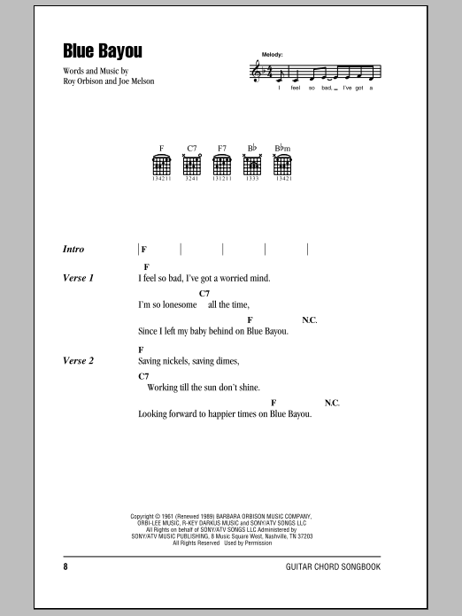 Download or print Roy Orbison Blue Bayou sheet music, chords and digital score arranged for Lead Sheet / Fake Book. This Country score includes 1 page(s).