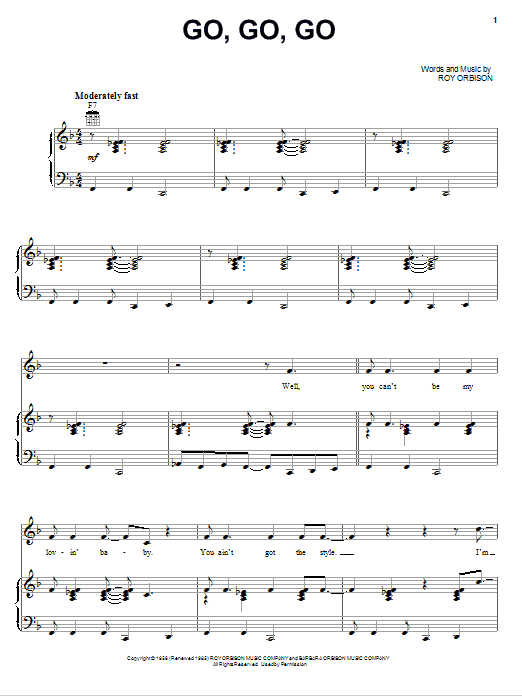 Download or print Roy Orbison Go, Go, Go sheet music, chords and digital score arranged for Piano, Vocal & Guitar Chords (Right-Hand Melody). This Pop score includes 7 page(s).