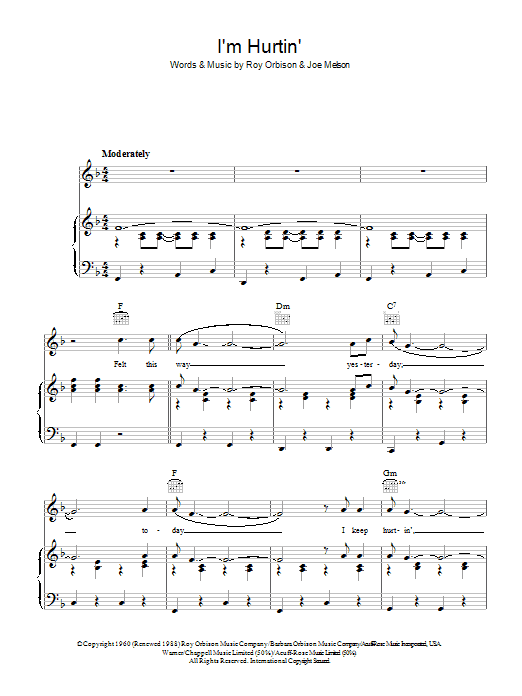 Download or print Roy Orbison I'm Hurtin' sheet music, chords and digital score arranged for Piano, Vocal & Guitar Chords. This Pop score includes 4 page(s).