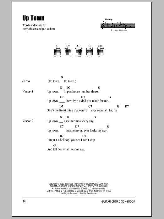 Download or print Roy Orbison Up Town sheet music, chords and digital score arranged for Piano, Vocal & Guitar Chords (Right-Hand Melody). This Pop score includes 4 page(s).