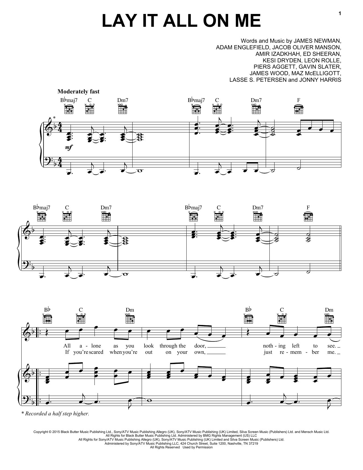 Download or print Rudimental feat. Ed Sheeran Lay It All On Me sheet music, chords and digital score arranged for Piano, Vocal & Guitar Chords (Right-Hand Melody). This Pop score includes 6 page(s).