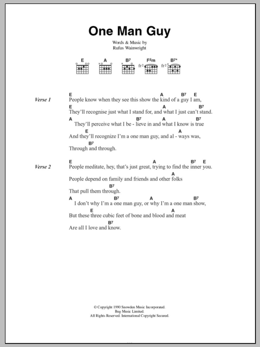Download or print Rufus Wainwright One Man Guy sheet music, chords and digital score arranged for Guitar Chords/Lyrics. This Rock score includes 2 page(s).