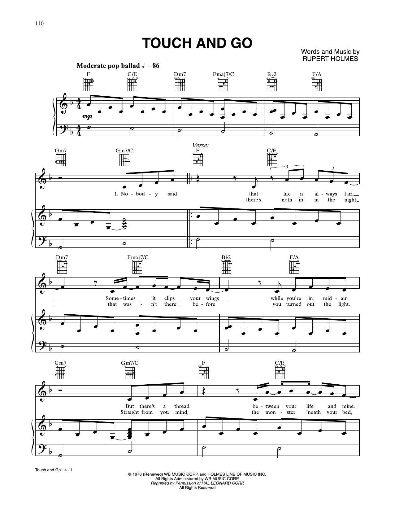 Download or print Rupert Holmes Touch And Go sheet music, chords and digital score arranged for Piano, Vocal & Guitar Chords (Right-Hand Melody). This Singer/Songwriter score includes 4 page(s).