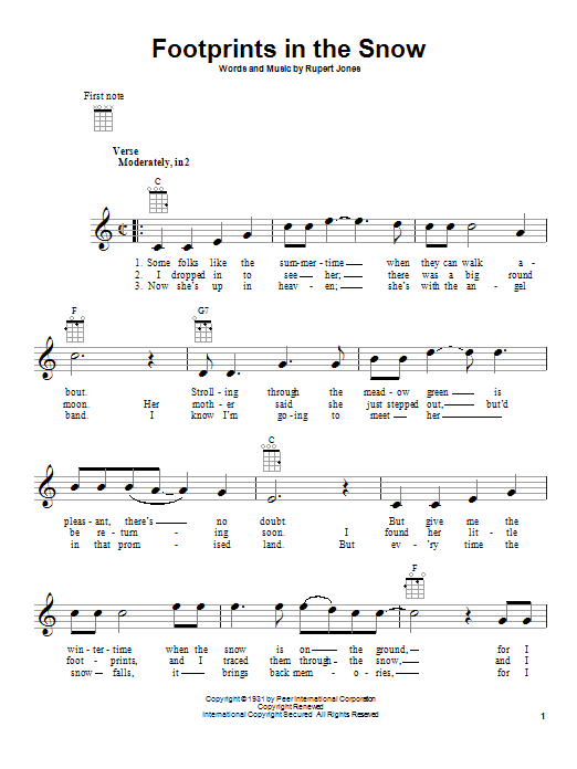 Download or print Rupert Jones Footprints In The Snow sheet music, chords and digital score arranged for Piano, Vocal & Guitar Chords (Right-Hand Melody). This Folk score includes 4 page(s).